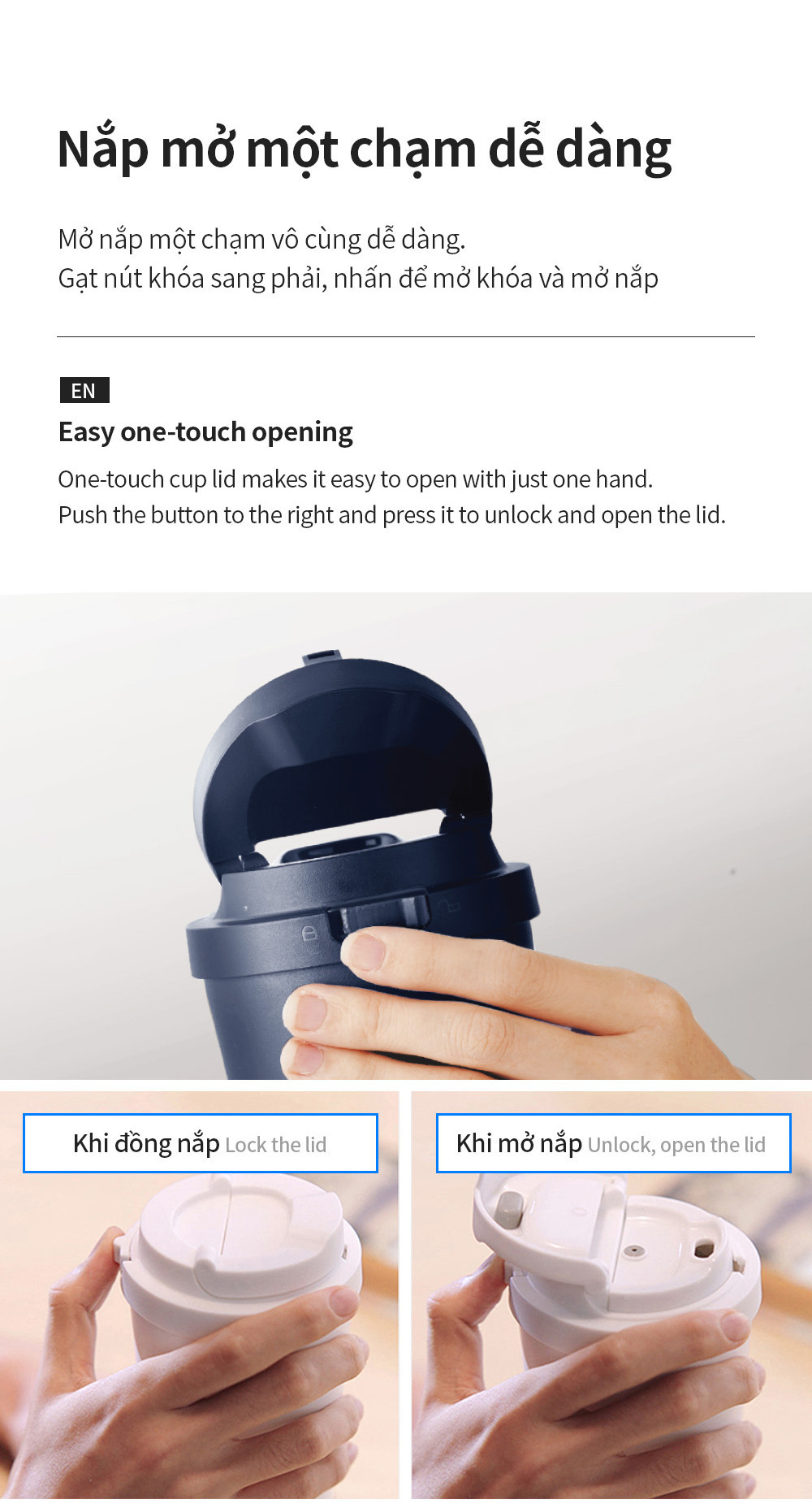 – NẮP MỞ MỘT CHẠM DỄ DÀNG: Đẩy sang trái để mở khóa đồng thời mở nắp