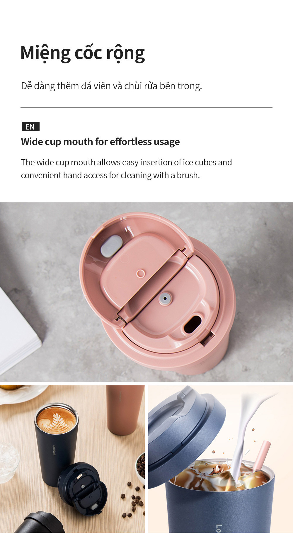 – Miệng cốc rộng: Dễ dàng thêm đá viên và chùi rửa bên trong