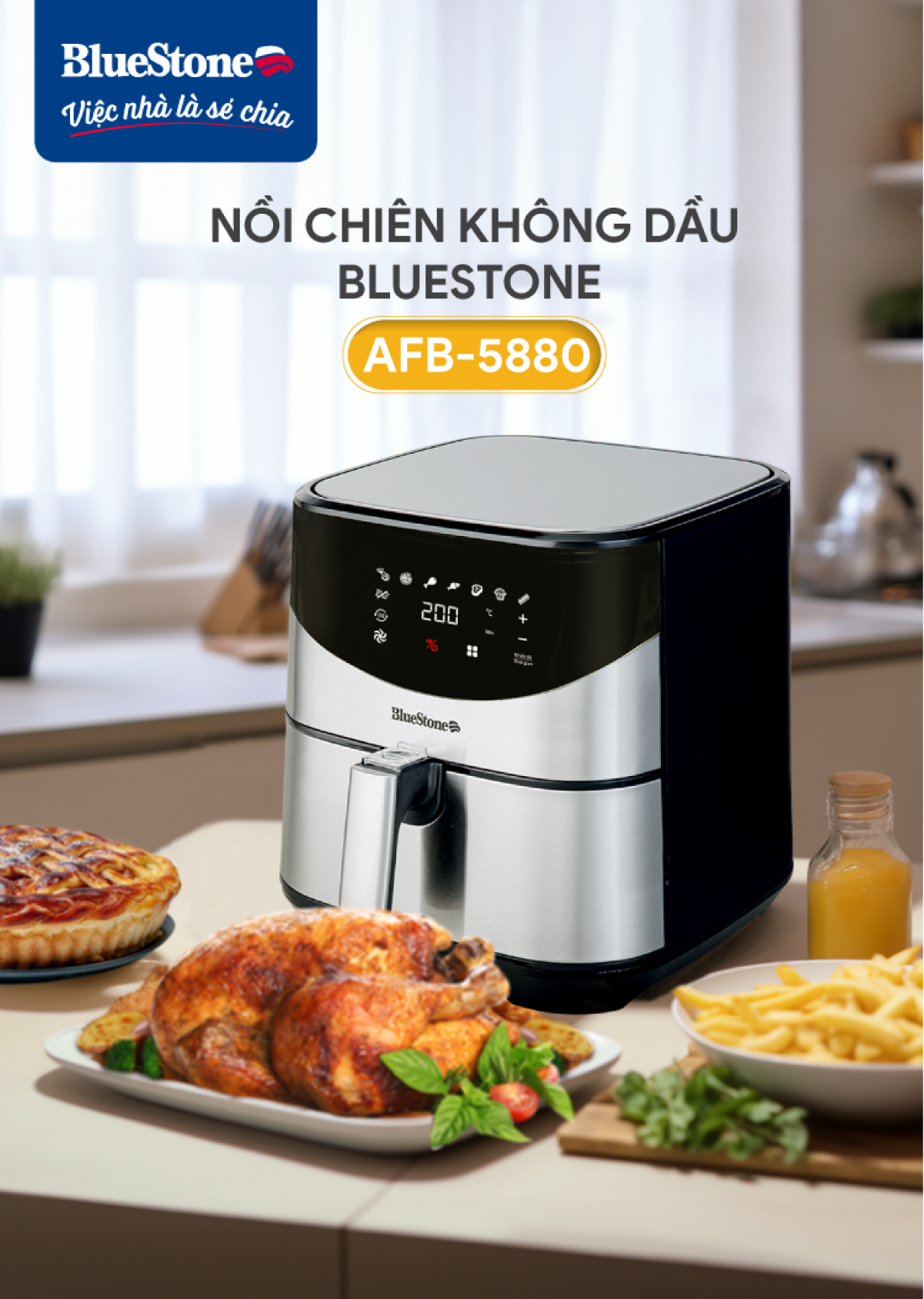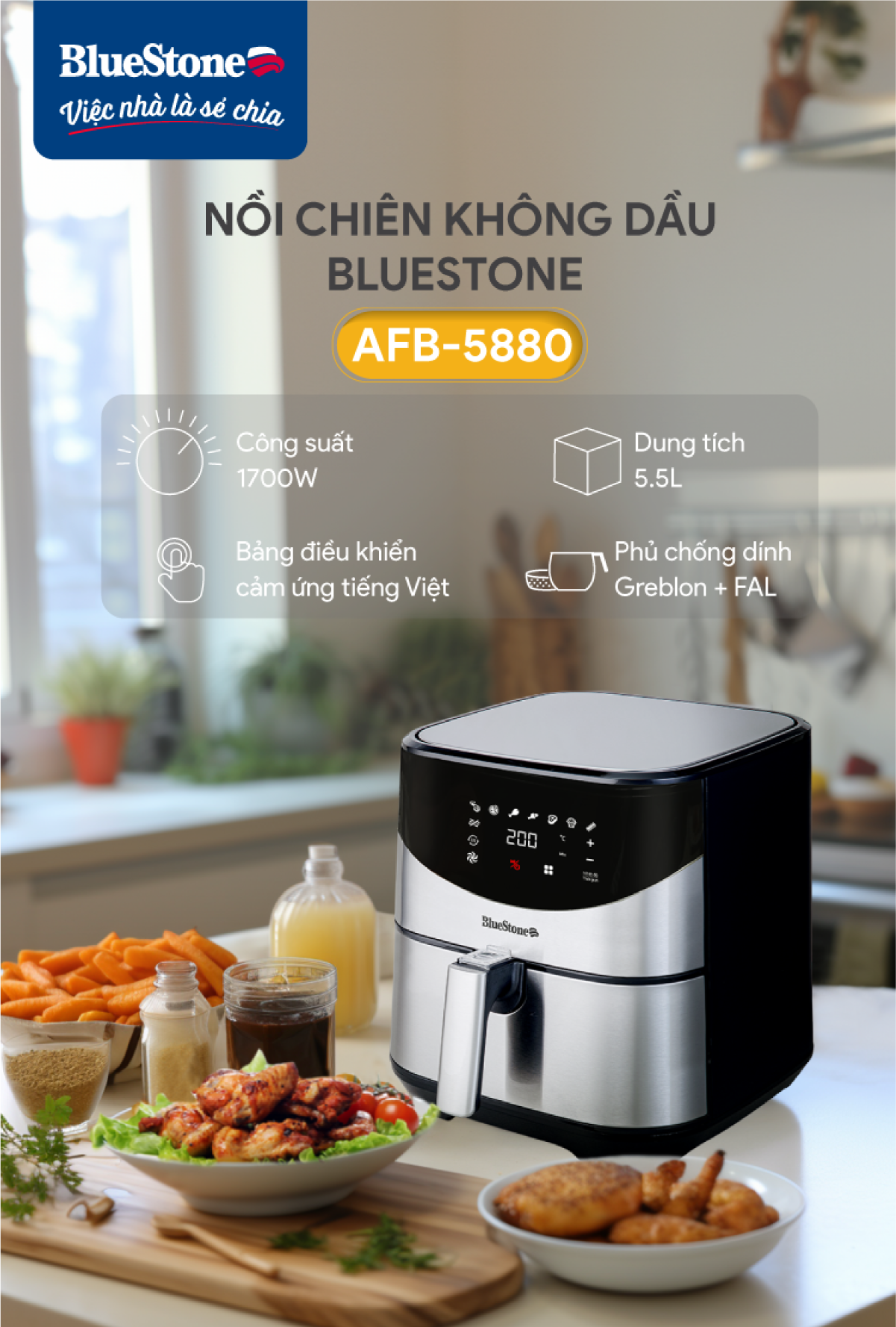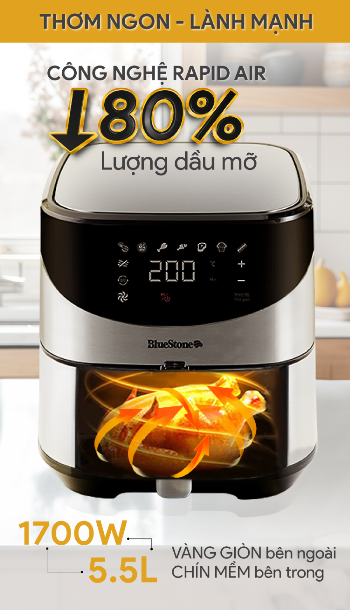 Nồi Chiên Không Dầu BlueStone AFB-5880 (5,5 Lít) sử dụng công nghệ chiên/nướng đối lưu Rapid Air – giảm 80% lượng dầu mở dư thừa.