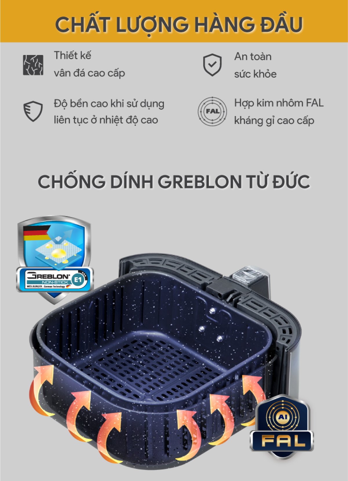 Rổ chiên, khai hứng dầu: Hợp kim nhôm phủ lớp chống dính Greblon từ Đức
