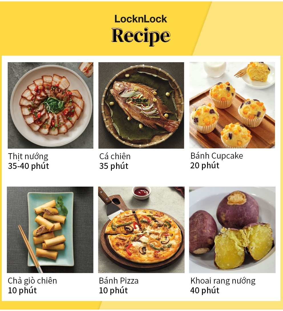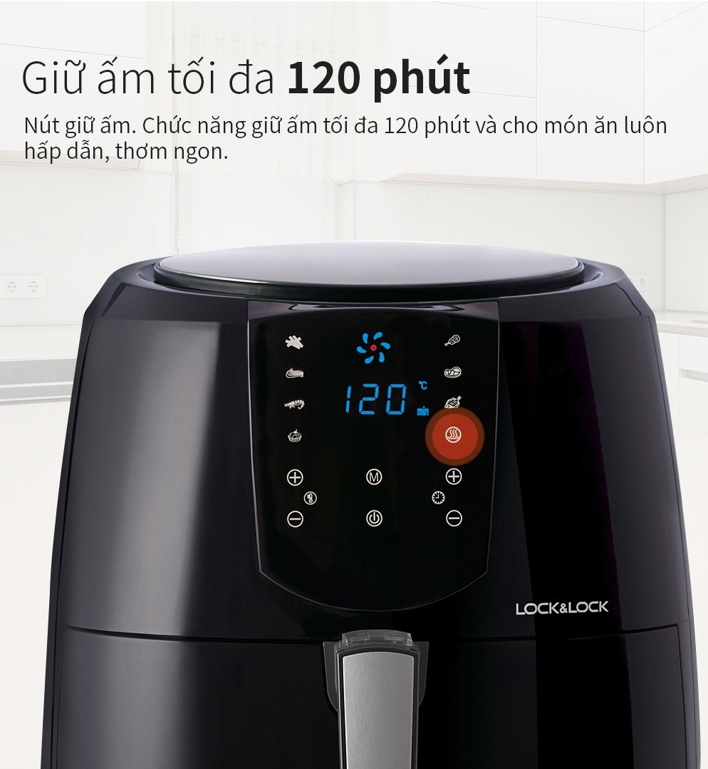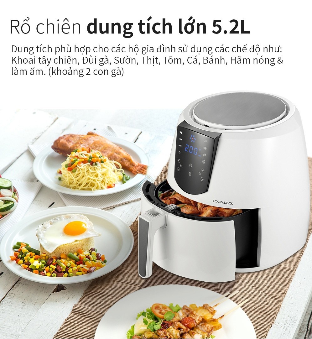 Nồi chiên không dầu Locknlock có 8 chức năng: Khoai tây chiên, Đùi gà, Sườn, Thịt, Tôm, Cá, Bánh, Hâm nóng & làm ấm, hãy sắm ngay cho gia đình mình 1 chiếc để cùng tận hưởng những bữa ăn ngon