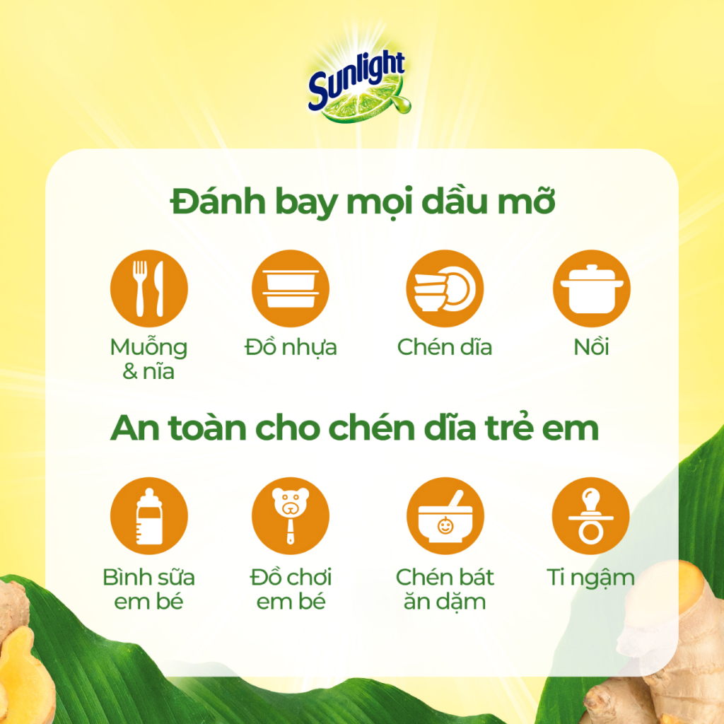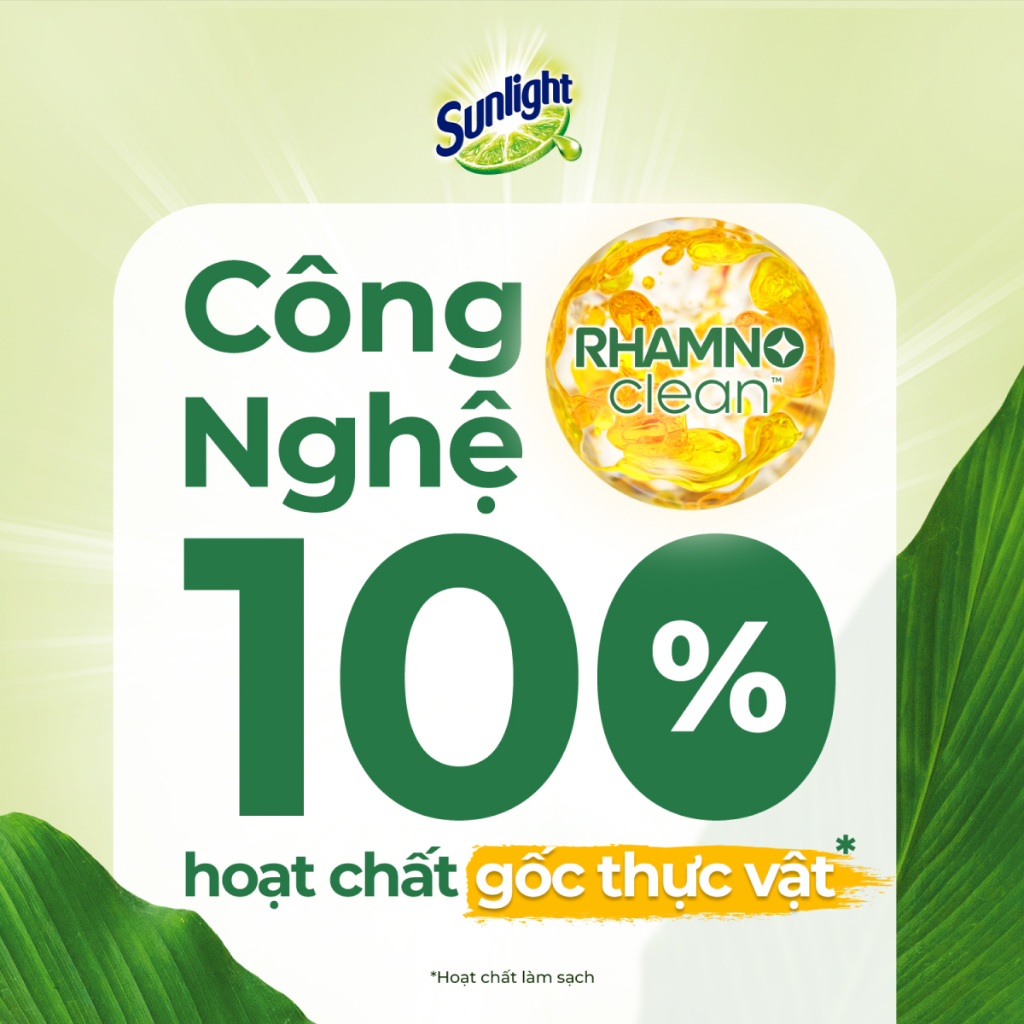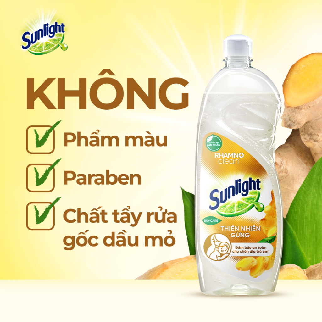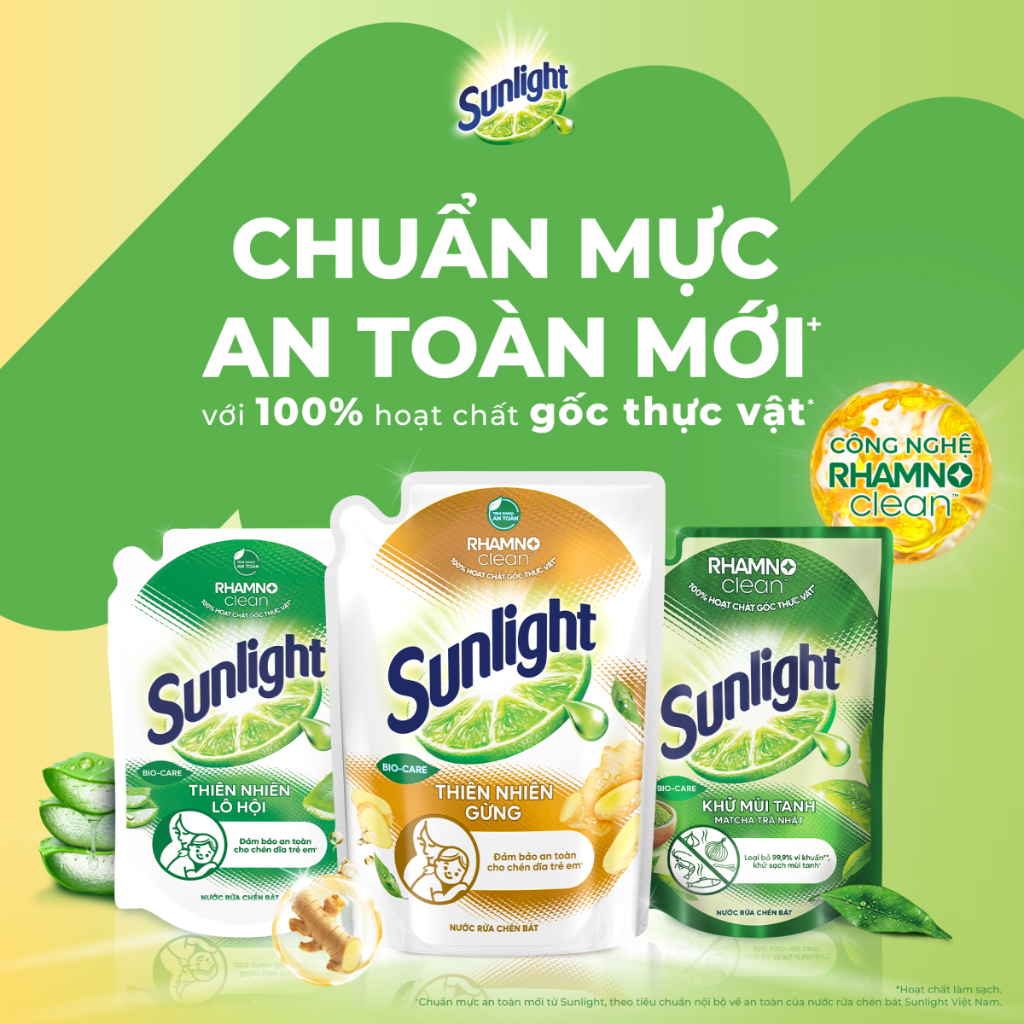 Sunlight ra mắt Nước rửa chén bát Sunlight Bio-care Mới với công nghệ độc quyền Rhamno Clean chứa 100% hoạt chất làm sạch gốc thực vật. Với cải tiến trong công thức, Sunlight Bio-care Mới mang đến chuẩn mực an toàn mới, đảm bảo an toàn cho chén dĩa trẻ em và cũng rất thân thiện với môi trường. Sunlight cam kết 0% hóa chất độc hại đến gần gia đình bạn, đảm bảo an toàn & lành tính.